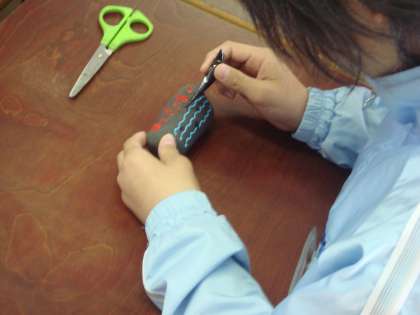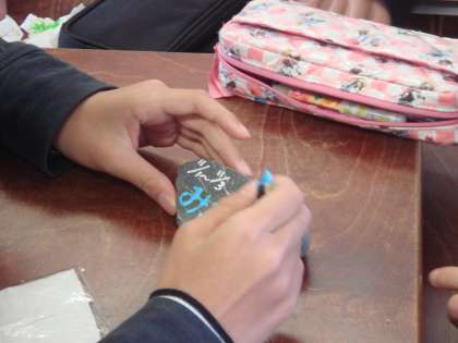 今日は,みさきの家の磯観察で拾ってきた石にカラーテックスで思い出を描きました。