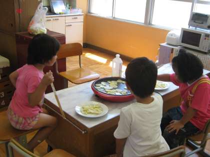 ジャガイモを切った後は,みんなでホットプレートで焼きました。