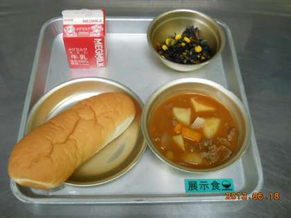 今日のメニューは、「味付けコッペパン、牛乳、トマトシチュー、ひじきのソティ」です。毎週火曜日は、パンの日。