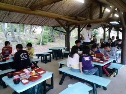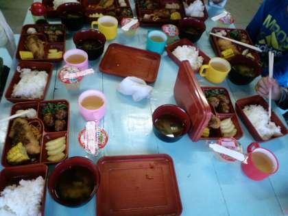 夕食です。食事係が頑張って配膳しました。とってもいい顔して食べています。みんな元気です。