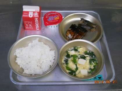 今日のメニューは、ごはん、牛乳、にしんなす、かきたま汁、りんごゼリーです。