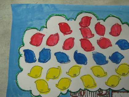 5時間目の図工では,絵の具で色塗りをしました。枠の中をきれいに塗ったり,2色以上の絵の具を使って別の色を作ったりしました。2つの組合せによってはいろいろな色ができることも学んでほしいです。