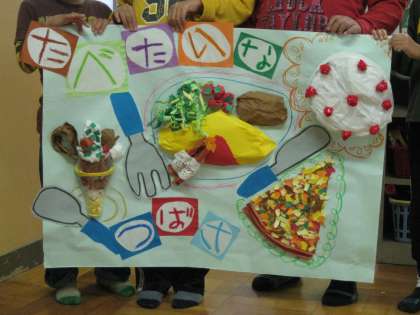来週からの給食週間に向けて,掲示物を作りました。みんなで,「給食にこんなものがでて欲しいなぁ・・・」をテーマに相談しました。最終,ハンバーグ,オムライス,いちごショートケーキ,チョコレートパフェ,ピザ,エビフライに決定!3週間かけて完成!!・・・おいしそうっ!