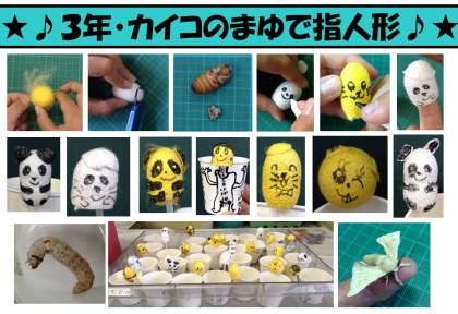 ◆カイコがたまごからでてこんなすてきなまゆを作るのがすごいと思った。まゆで指人形が作れるのをはじめてしりました。完成したとき,○○さんにじょうずやなぁといわれました。ぼくは,パンダの作品を作りました。すごくおもしろかったです。