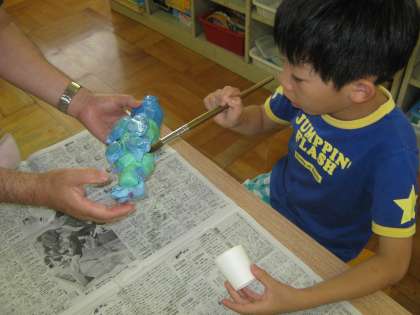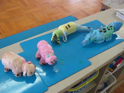 先日粘土で形を作った生き物に,今日はニスを塗って磁石をつけました。