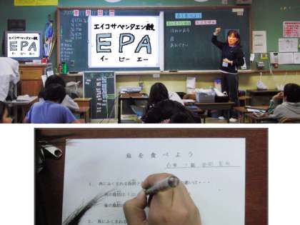 <魚を食べよう>のテーマで,栄養教諭による自作コンテンツを使用して学習が進められました。魚に多くふくまれるエイコサペンタエン酸(Eicosapentaenoic acid、EPA)のはたらきがわかりやすく表示されていました。★ミ!