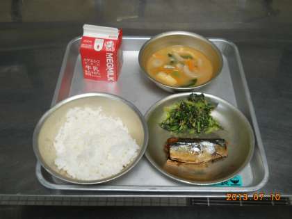 今日のメニューは、「ごはん、牛乳、さんまのしょうが煮、だいこん葉のごまいため、いものこ汁」です。