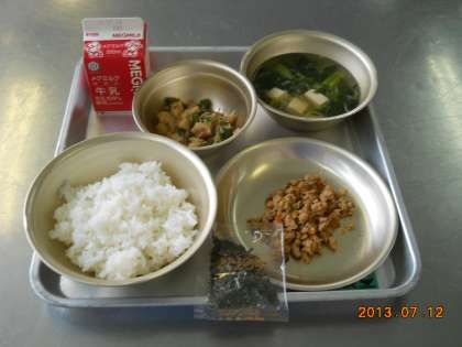 今日のメニューは、「とりそぼろ丼、牛乳、伏見とうがらしとじゃこのいため煮、すまし汁」です。