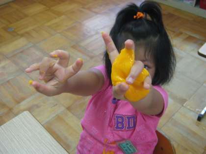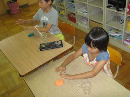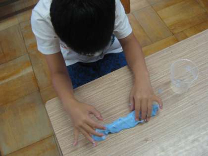 水に洗濯のり,ホウシャ水溶液と混ぜていくうち,だんだん固まってきてどろどろになる様子に,子ども達は興味津々でした。