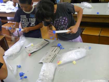 「とじこめた空気や水」の学習のまとめをしました。これまで,閉じ込めた空気を圧すと,体積は小さくなるが,圧し返す力は大きくなることや,水は圧し縮められないことを学びました。その性質を生かし,空気鉄砲や水鉄砲をつくり,楽しみました。早速,お家にその装置を持ち帰られましたので・・・,また楽しんでられることでしょう!!
