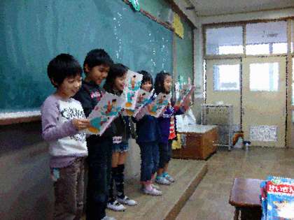 17日(火)の1〜2時間目は長距離走大会が中止になったので,国語で学習していた「お手紙」(アーノルド=ローベル作)の音読発表会を行いました。かえるくん,がまくん,かたつむりくん,ナレーターの役に分かれて班ごとに発表しました。登場人物の気持ちを想像しながら声の大きさなどを工夫して音読しました。がまくんは工夫しやすかったようで上手に読んでいた子が何人もいました。ナレーターも間の取り方などを工夫して読めた班がありました。日々の学習の成果が発揮できた発表会だったと思います。毎日,宿題の音読を聞いていただいてありがとうございました。