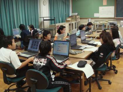 その後,各自がコンピュータを使って洪水について調べていきました。理科支援員も子どもたちの学習の支援をしてくれています。