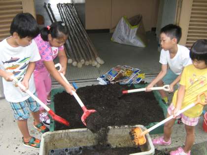 深めのプランター4つ分,みんなで協力して土を入れました。