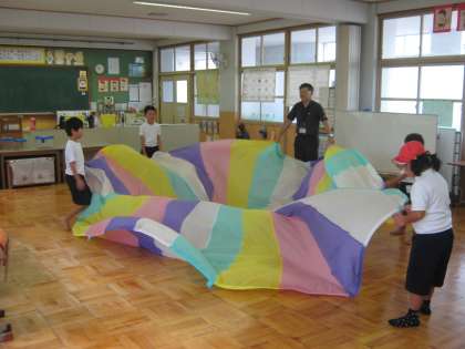 音楽に合わせて行進したり,みんなで力を合わせて上に高く上げてふくらませたりする練習をしています。