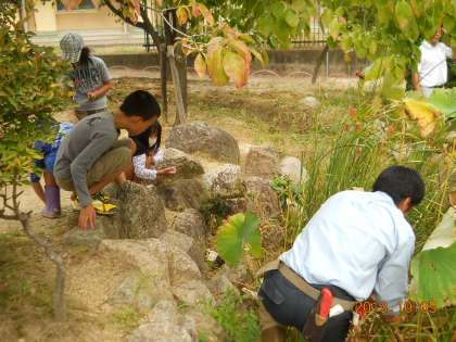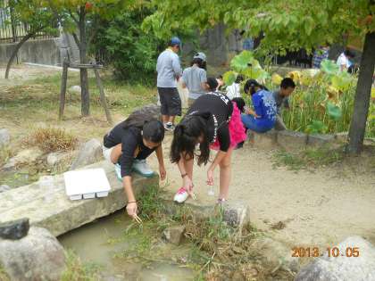 ビオトープ学習では「池」「川」「陸」の3つの班に分け,それぞれの場所で生息している生き物を探しています。