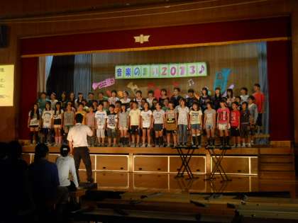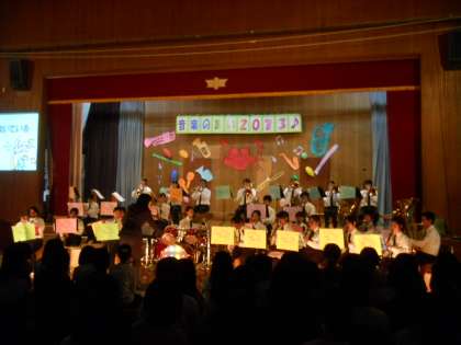 大淀中学に美豆小とともに通うことになる明親小学校と大淀中学の生徒が音楽を通して交流を深めることを目的に毎年行っています。大淀中学は吹奏楽部が演奏を披露し、最後には三校の児童・生徒が吹奏楽部の演奏に合わせて「君をのせて」を歌い、心を一つにしました。