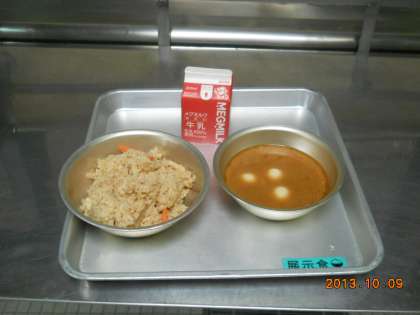今日のメニューは、「炊きこみ五目ごはん、牛乳、みそ汁」です。保護者の皆さんには、書面でお伝えしていましたが、今日のメニューは、学校に常備している物資を使用した台風献立です。