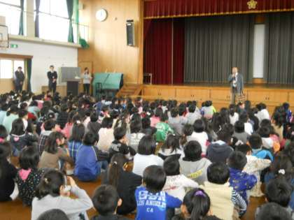 訓練の後は,暑い日も寒い日も,雨の日も風の日も,みんなの下校時の安全を見守ってくださっている「見守り隊」の方々をお招きして,感謝の気持ちを伝える「感謝の集い」を行いました。