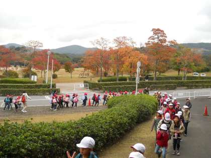 教室での支度も早く済み,予定より少し早くバスに乗り込み出発することができました。バスの中では,通路を挟み1・2年生が仲良く話をする姿が見られ,