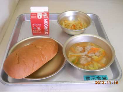 11月19日の献立は,「黒糖コッペパン・牛乳・肉だんごのスープ煮・じゃがいものピリカラいため」でした。