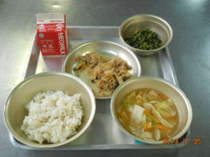 11月25日の献立は,「麦ごはん・牛乳・豚肉とこんにゃくのいため煮・だいこん葉のごまいため・キャベツの吉野汁」でした。