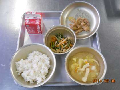 2月6日の献立は,「麦ごはん・牛乳・鶏肉のあまから煮・野菜のきんぴら・キャベツのみそ汁」でした。“鶏肉のあまから煮”は,鶏肉もやわらかく,しっかりとした味つけで,ご飯にあう味つけでした。子どもたちには,人気でした。