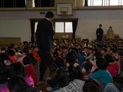 校長より,各階の廊下に飾ってある花は,何のためにあるのかについての話をしました。きれいな花を見ながら穏やかに廊下や階段を歩いてほしいです。その後,2月の生活目標「廊下の歩き方に気をつけよう(右側通行・静かに歩く)」についての話がありました。