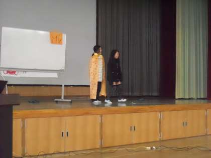 保健委員会から正しいトイレの使い方について寸劇を交えた発表がありました。トイレットペーパーなどが便器に残らないようきちんと流すことやきちんと手を洗うことの大切さ,スリッパの整頓等についてみんなで考えました。