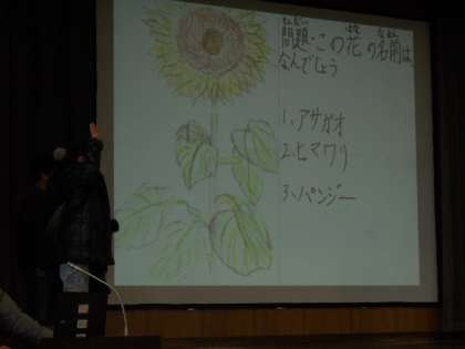 環境委員会は,委員会での活動の様子や学校で育てている木や花についてのクイズをしました。手作りのポスター風のクイズを大きく写しだし,みんなでクイズを楽しみながら委員会のこと・植物のことを学びました。