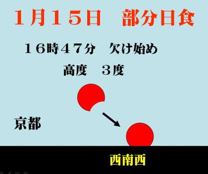 1月15日の日没直前に、中部地方より西側で部分日食が見られるようです。