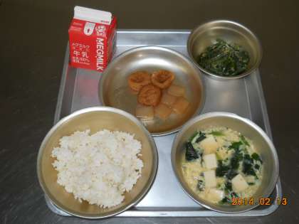 2月13日の献立は,「麦ごはん・牛乳・平天の煮つけ・三度豆のごま煮・かきたま汁」でした。