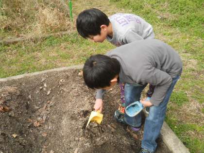 ミミズはつばさ畑に連れて行って,つばさ畑の土が豊かになるように埋めました。