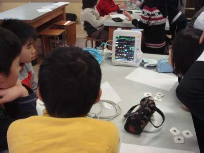 ほとんどの子どもが,自分の心臓の動きを目の当たりにするのは初めてです。興味津々で機器を扱っていました。