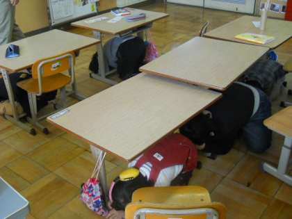 訓練では,放送を聞いて頭を守って姿勢を低くし,机の下に隠れることができました。