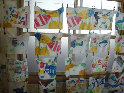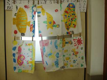 カラー版画を刷ってみました。出来上がった版の上に濡れた和紙を置いて上からこすって刷りとります。和紙の濡らし加減がなかなか難しく,濡れ過ぎているとにじんでしまい,逆に濡らし方が足りないと版が和紙に張り付いてインクがはがれたりしました。一人三枚刷るうちにコツをつかんで鮮やかに刷れました。版の段階と刷り上がりでは色合いが違うので「すごくきれいにできた!!」と喜んでいる子が多かったです。
