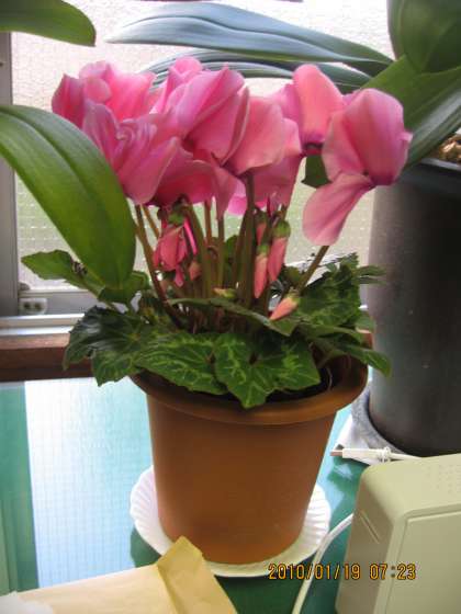 おはようございます!! 今日は温かくなりそうな予報で,ホッとしています。以前,校長室の前の畑にほおってあったシクラメンを紹介しました。年を越し,見事に花が上がってきました。