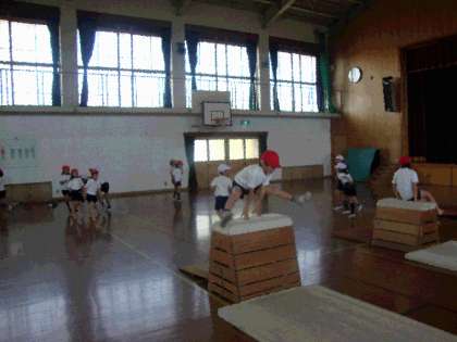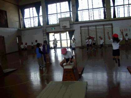今月から体育館での体育は跳び箱遊びをします。一年ぶりの跳び箱でしたが元気よく跳び箱に向かっていました。跳び越える練習として跨ぎ越したり,跳び乗ったりの練習もしました。上手な子は大きく脚を開いて勢いよく跳び越していました。