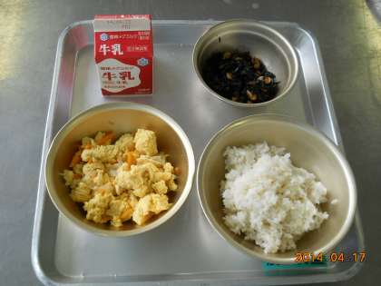 4月17日の献立は,「麦ごはん・牛乳・あげたま煮・ひじき豆」でした。