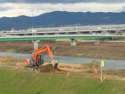 おはようございます!! 宇治川堤防の工事が進んでいます。樹木の伐採で,河原がとても広くみえます。土手の舗装も計画されているようです。