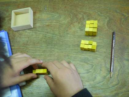 1㎤(1立方センチメートル)の積み木の数を数え,その数で大きさを表したり,2つの立体の大きさを比較しました。今後は,体積を計算で求めたり,辺と長さとの関係から公式へと導いていきます。