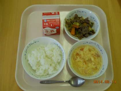 5月14日の献立は,「ごはん・牛乳・焼肉・トマトと卵のスープ」でした。