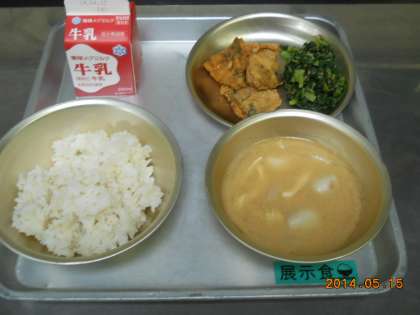 5月15日の献立は,「麦ごはん・牛乳・あじのこはくあげ・だいこん葉のごまいため・いものこ汁」でした。