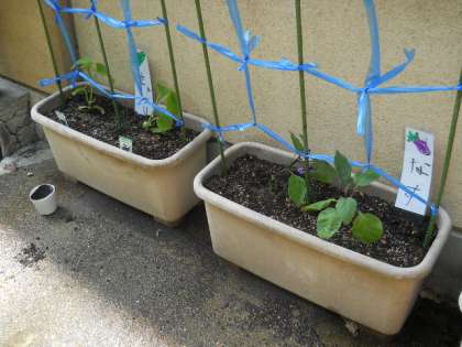 プランターにナスとキュウリを,つばさ畑に小玉スイカの苗を10本植えました。