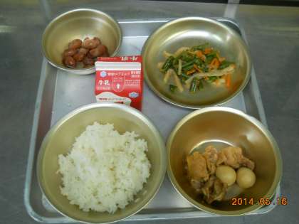5月16日の献立は,「ごはん・牛乳・鶏肉のさっぱり煮・野菜のきんぴら・金時豆の甘煮」でした。