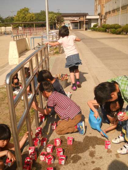 ホウセンカとヒマワリの種を牛乳パックにまきました。とても楽しそうに活動していました。この楽しさをもとに学習を進めるとともに,責任をもって世話をしていきます。