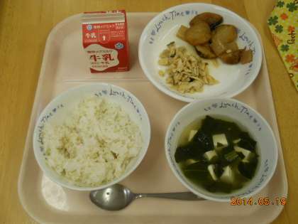 5月19日の献立は,「麦ごはん・牛乳・たけのこごはん(具)平天の煮つけ・すまし汁」でした。