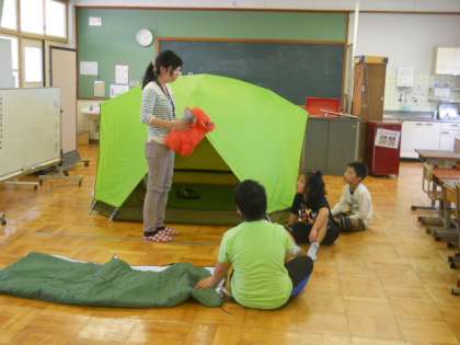 その活動に向けて,学級でテントを立てて寝袋で寝る学習をしました。