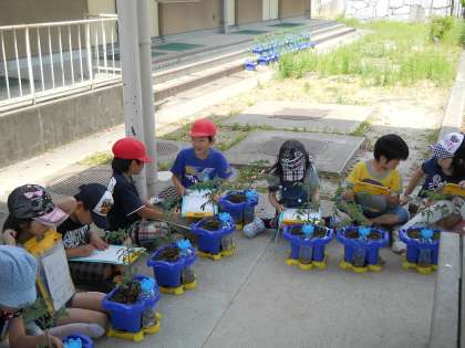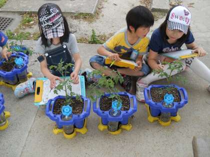 今日は,ミニトマトの観察をしました。1大きさ 2葉の数 3葉の色 4気づいたことの視点に絞って観察しました。