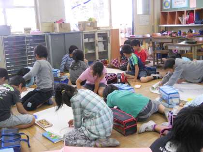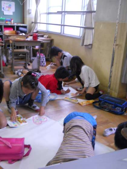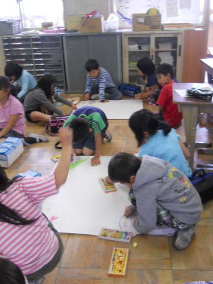 図工の学習で,グループで協力して1枚の絵を作成しています。自分の好きな形の国を作り,お互いの国へ線のあいさつをしています。どんな素敵な作品が出来上がるでしょうか。