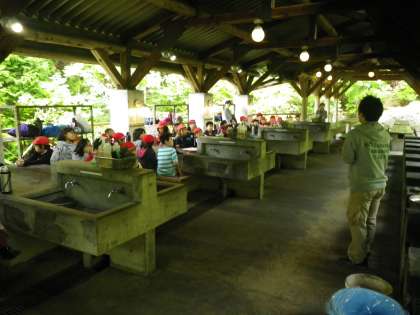 山の家の所員さんのお話をしっかり聞いています。